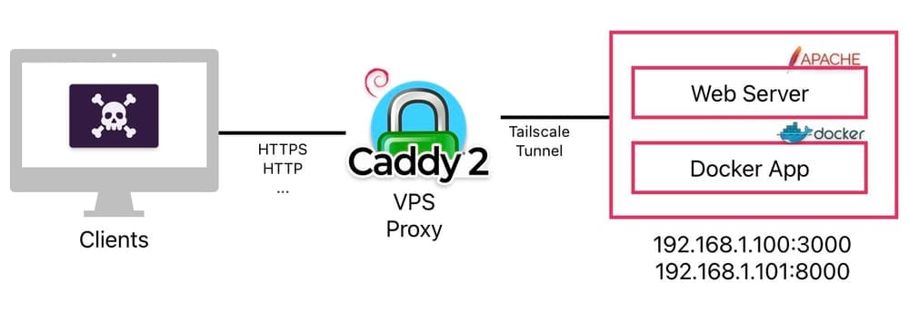 [Client] → https://yourdomain.com → [VPS + Caddy] → Tailscale Tunnel → [Your LAN service]